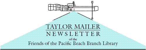 ![]() The Taylor Mailer Newsletter is the official bulletin of the Friends of the Pacific Beach Library. The Taylor Mailer is published periodically throughout the year, is mailed to all members of the Friends of the Pacific Beach Library, and is made available to the general public at the Pacific Beach/Taylor Branch Library and electronically via this website. In addition to communicating announcements, events, and other information to the members of the Friends, the Taylor Mailer is used to publicize the Friends of the Pacific Beach Library to prospective members. The Taylor Mailer Editor wants your suggestions! Please send email with your suggestions for the newsletter to our Newsletter Editor via our Contact Us web page (==> Click Here <==). Issues of Taylor Mailer available for online viewing and printing are: